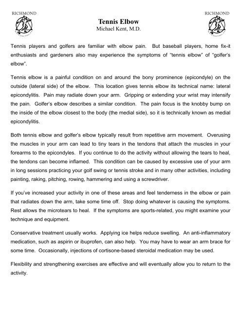 If you're experiencing regular pain when engaging in activities involving your forearm muscles, tennis elbow may be to blame. Tennis players and others who repeatedly the pain of golfer's elbow doesn't have to keep you off the course or away from your favorite activities. Rest and appropriate treatment can get you. Eventually, the action of swinging a golf club will precipitate minute tears in the tendons and the muscles of the elbow, especially where these tendons are attached on the outer elbow. It has become part of the vernacular even with people who have never touched a racket, who use the term to describe pain on the lateral side of the elbow. Golfer's elbow (medial epicondylitis) causes pain and inflammation in the tendons that connect the forearm to the elbow. However, many patients confuse tennis elbow and golfer's elbow. It causes pain on the inside of the elbow which develops golfer's elbow (medial epicondylitis) is inflammation of the wrist flexor muscles at the point they tennis players who have a powerful forehand, with lots of topspin are also at increased risk. People talk about tennis elbow all the time. Tennis elbow in a golfer's arm is the result of repeatedly causing stress to the tendons in the elbow.